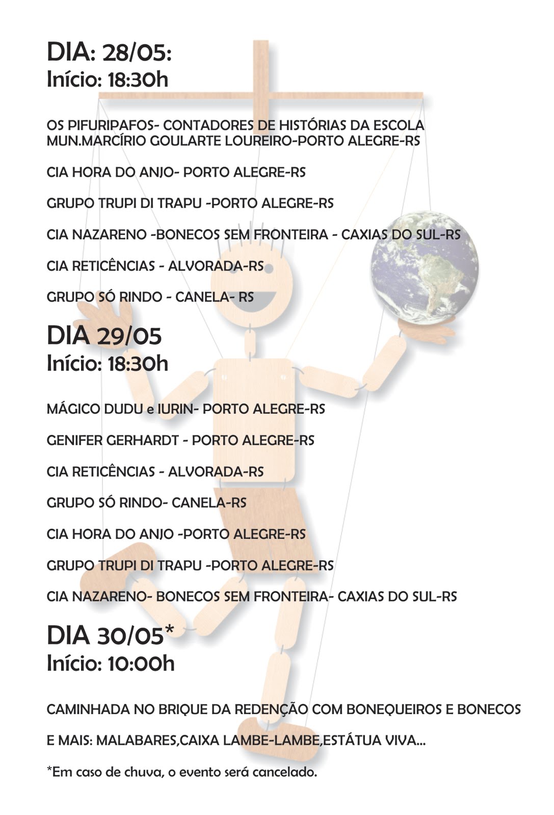 SEGUE MATERIAL DE DIVULGAÇÃO DA I* SustentaAÇÃO -MOSTRA SUSTENTÁVEL DE TEATRO DE BONECOS DE PORTO ALEGRE. UMA REALIZAÇÃO CENTRARTE- ARTE TERAPIA E PSICOLOGIA, ORGANIZAÇÃO TRUPI DI TRAPU - TEATRO DE BONECOS. REPASSEM PARA OS AMIGOS,VAMOS FAZER DE PORTO ALEGRE A CAPITAL DOS BONECOS NESTES TRÊS DIAS DE EVENTO!!!