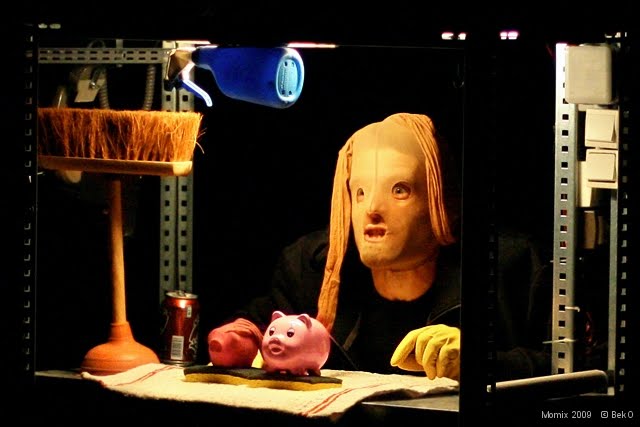 O cenário é composto por diversas estantes povoadas por objetos inusitos. A maior parte animados no espetáculo. Uma infinidade de lâmpadas e ligações elétricas são frequentemente acionadas. A trilha sonora, imagem e manipulação funcionam de modo incrivelmente sincronizado. Procurei por todo o tempo pelo pessoal que auxilia no cenário, na disposição de objetos, mas, não os encontrei. O trabalho cênico é peculiar, próximo do que ouso chamar de "perfeito".