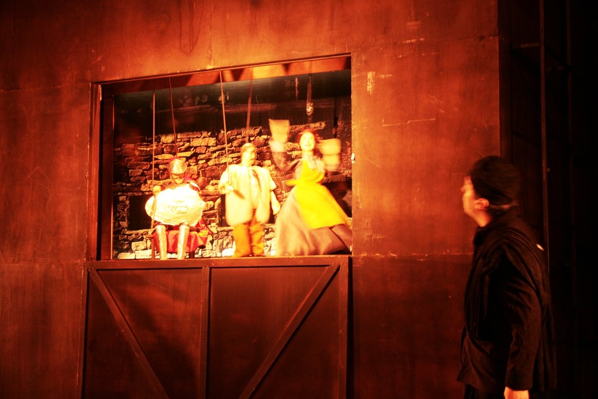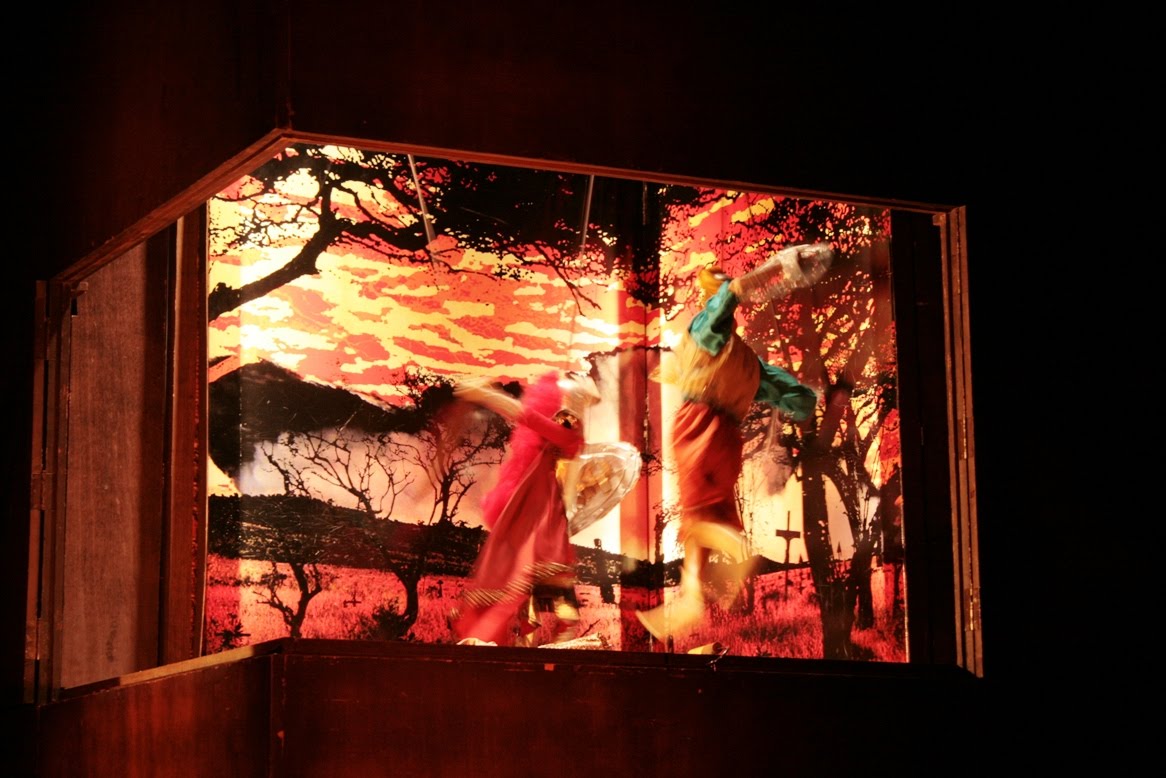 O cenário é "limpo", porém bastante interessante. Um cubo grande em madeira com diversas bocas de cena. Nelas eram manipulados bonecos e apresentados os cenários, sempre definidos por um painel de fundo. Artistas também narravam pelas janelas.