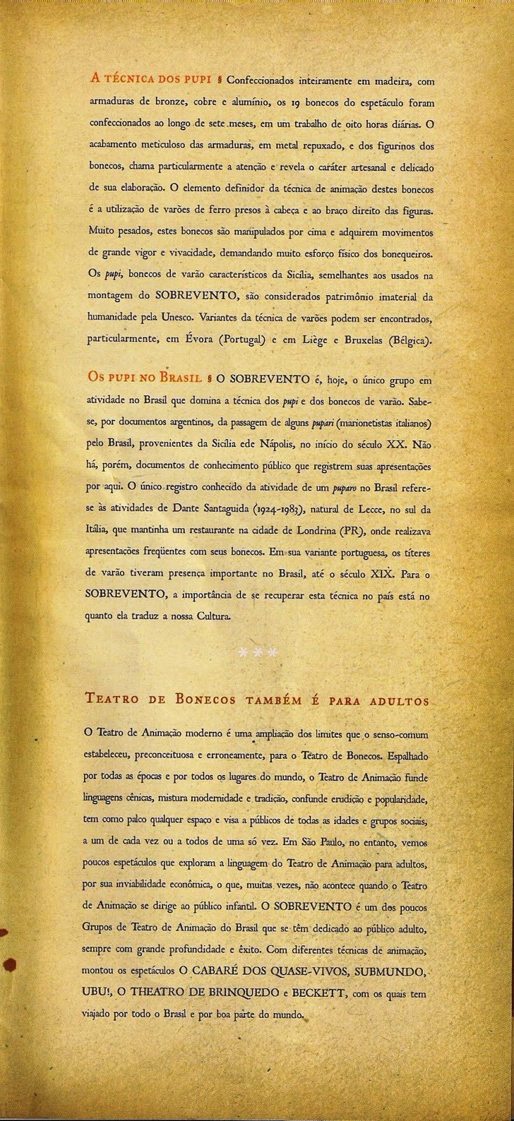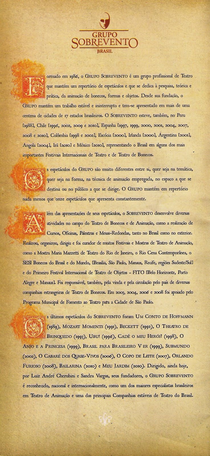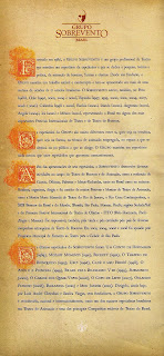 Ao entrar no local do espetáculo, recebemos este material. Dividimos com você a oportunidade de conhecer um pouco mais sobre o espetáculo e o Grupo Sobrevento.